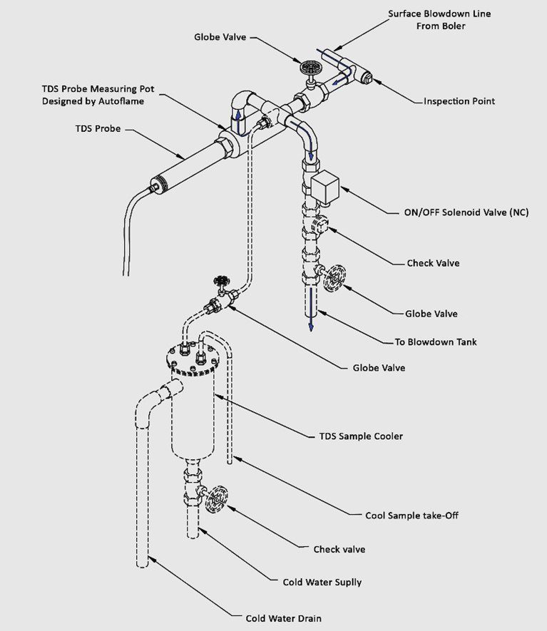 برای کارایی و قابلیت اطمینان بهینه دیگ بخار، یک نیاز مهم این است که اطمینان حاصل شود که کل جامدات محلول (TDS) در آب اندازه گیری و تا سطح مناسب برای دیگ کنترل شود. به طور کلی پذیرفته شده است که برای دیگ‌های واترتیوب، سطح TDS اندازه گیری شده نباید از 1500 پی پی ام در حجم تجاوز کند و برای دیگ‌های فایرتیوب، TDS نباید بیشتر از 2500 پی پی ام حجمی باشد. ارقام اعلام شده قطعی نیستند و در همه کاربردها توصیه‌های سازنده دیگ بخار یا شیمیدان تصفیه آب باید اجرا شود.